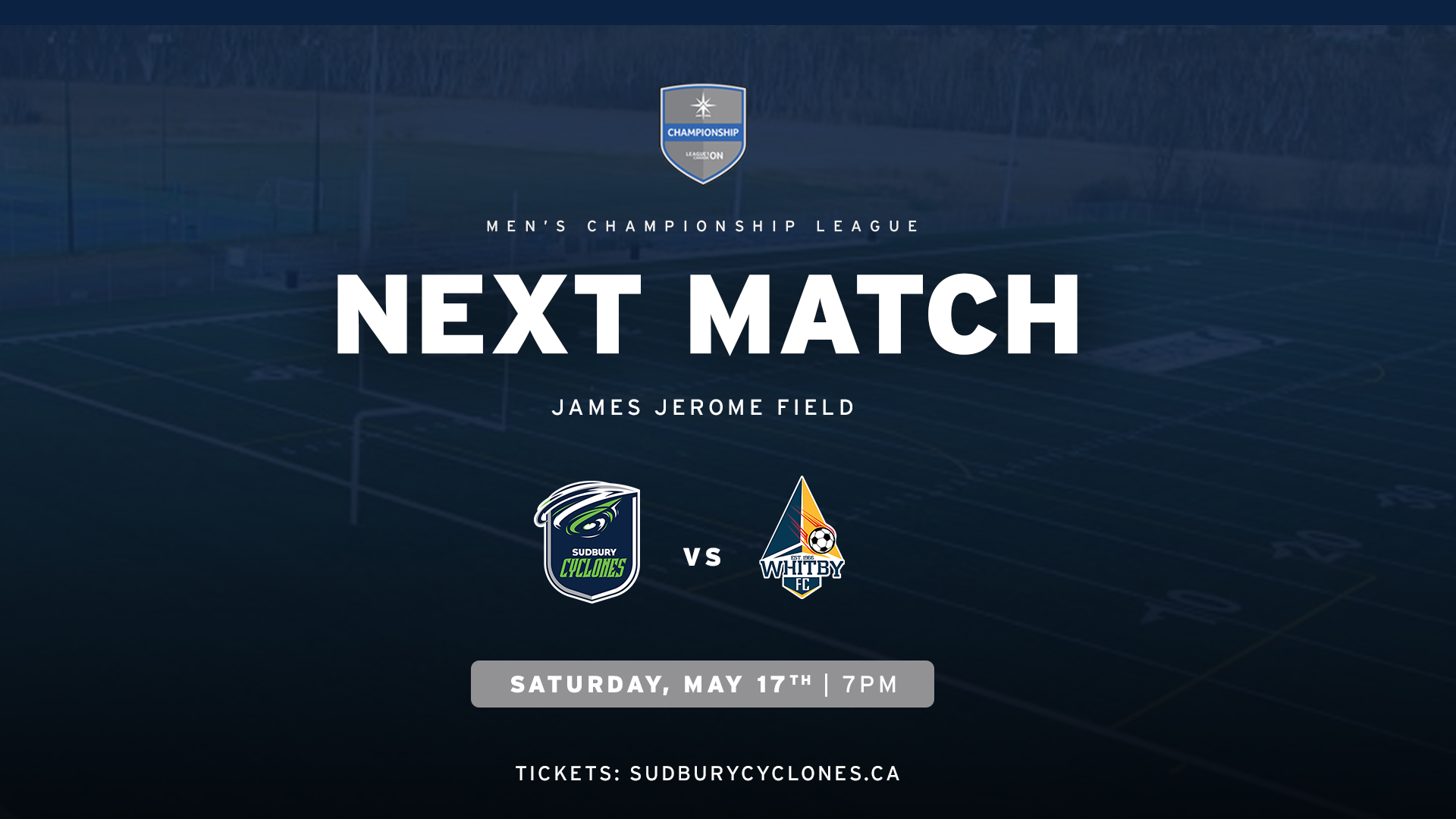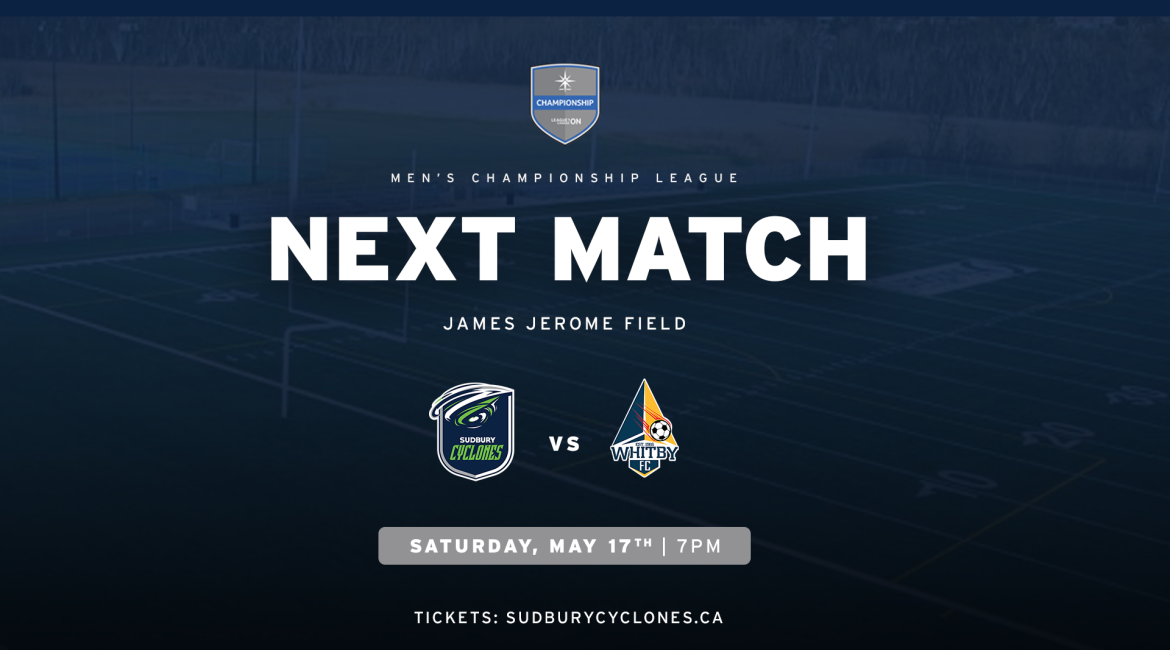 (Greater Sudbury, ON) – The Sudbury Cyclones’ men, coming off an impressive 3-0 win in Hamilton, return home to the James Jerome turf to take on Whitby FC. Kick-off is slated for Saturday, May 17th at 7:00 pm.